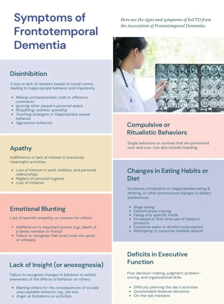 Here are the symptoms of bvFTD from the Association of Frontotemporal Dementia: